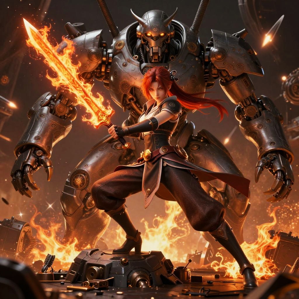 Digital artwork of a fiery battle: a red-haired warrior with a glowing sword stands defiantly against a towering, armored mech amidst blazing flames. Dynamic,