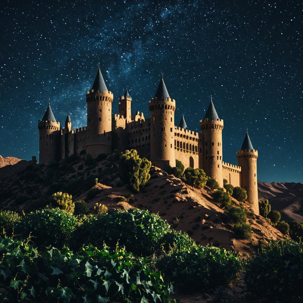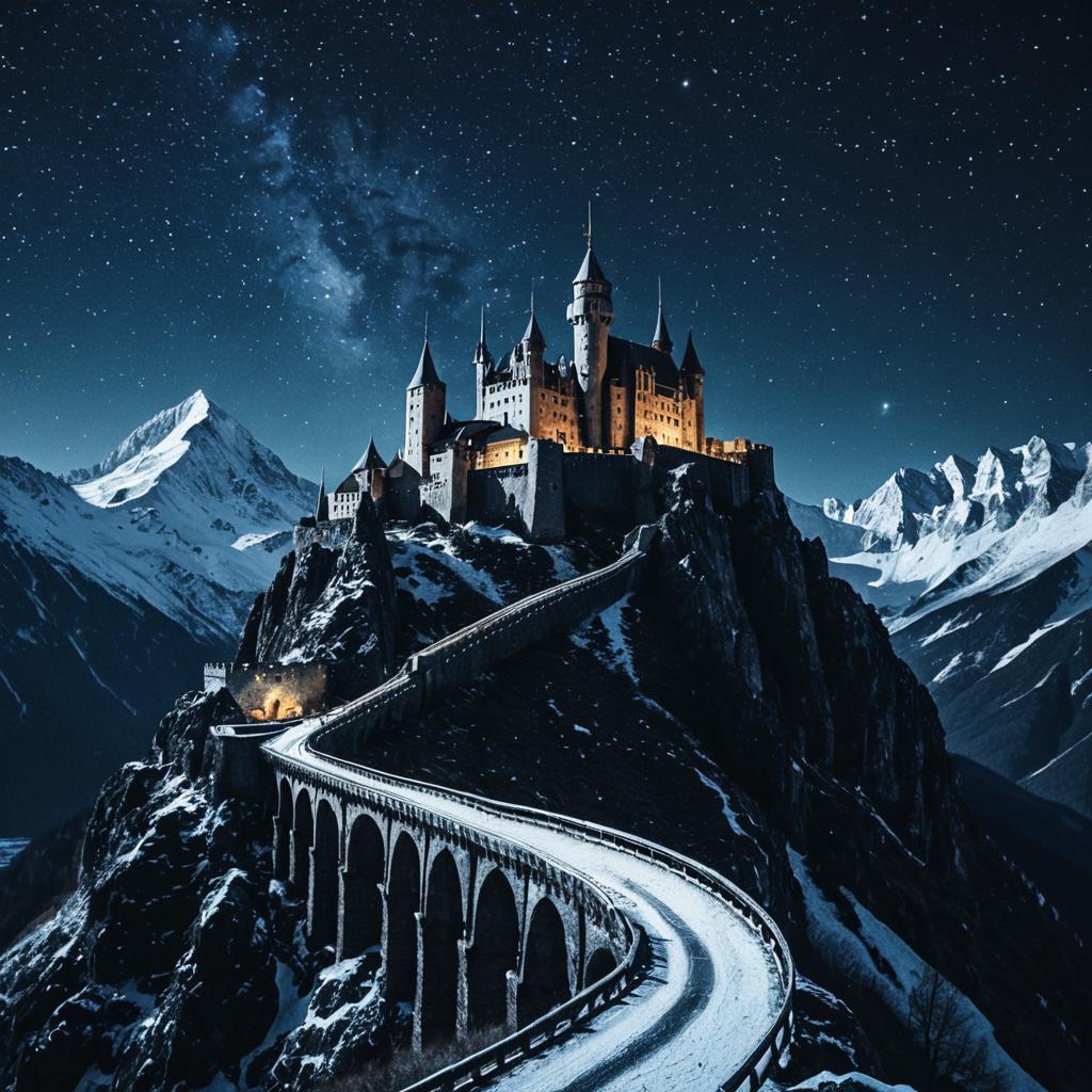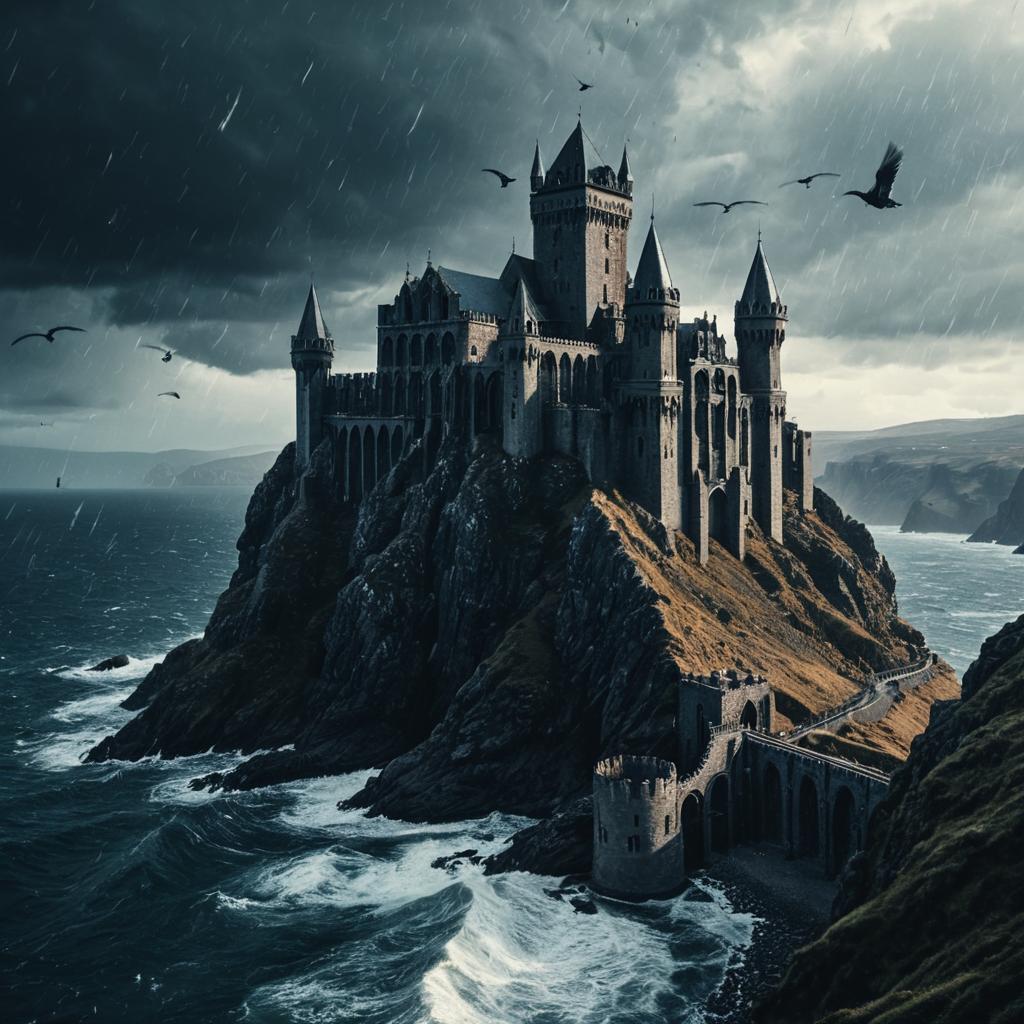 Vast castle with massive gates and stone battlements perched on a high mountain above a rugged cliffside beside roaring ocean. Captured in cinematic lighting with an ultra-realistic 4K finish.