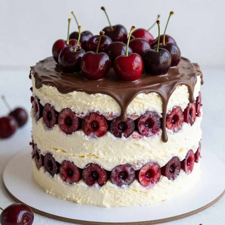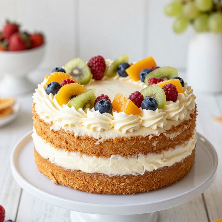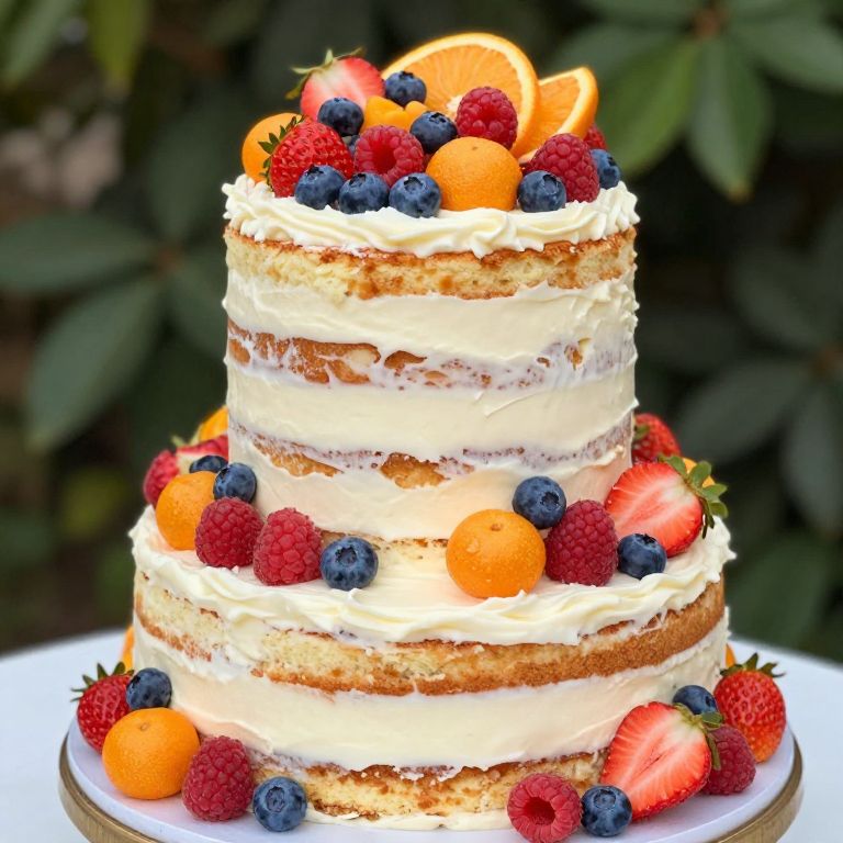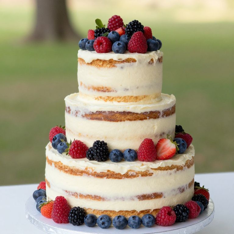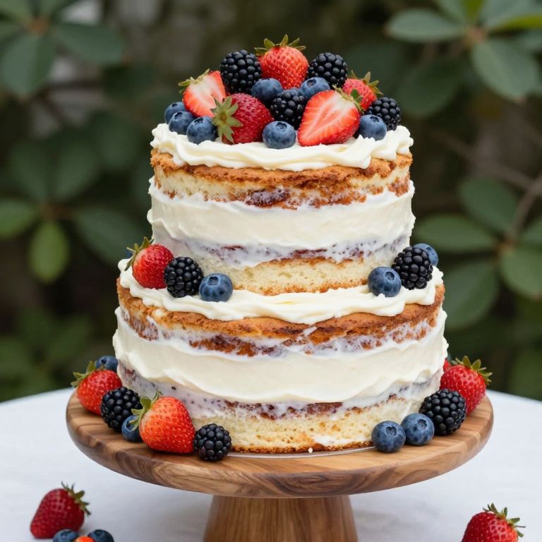 Naked cake with layers of cream cheese frosting and fresh berries, including strawberries and blueberries, sits atop a white plate, surrounded by rustic garden decor featuring two glass jars filled with white roses and green foliage, all set on a wooden table covered with a beige linen cloth.