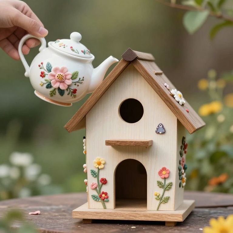 A whimsical teapot transforms into a charming birdhouse, defying convention with its playful floral embellishments and inviting entryway, creating a magical haven where nature meets nostalgia.