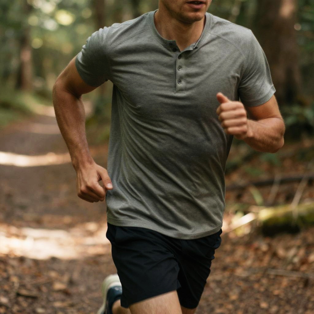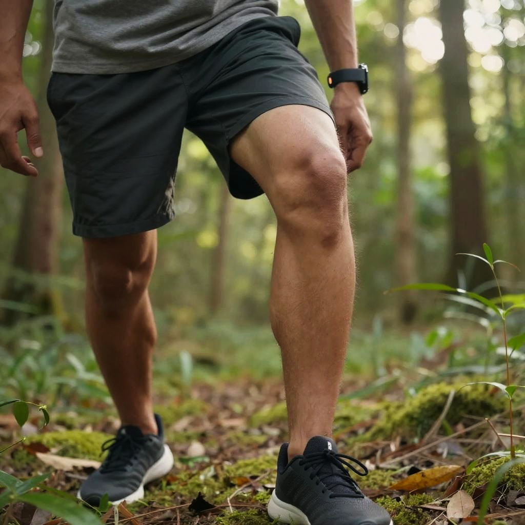 Rodillas close-up of a person in athletic wear kneeling on a vibrant forest floor, soft morning sunlight filtering through the trees, detailed textures of skin and fabric, dynamic and natural pose, photorealistic style.