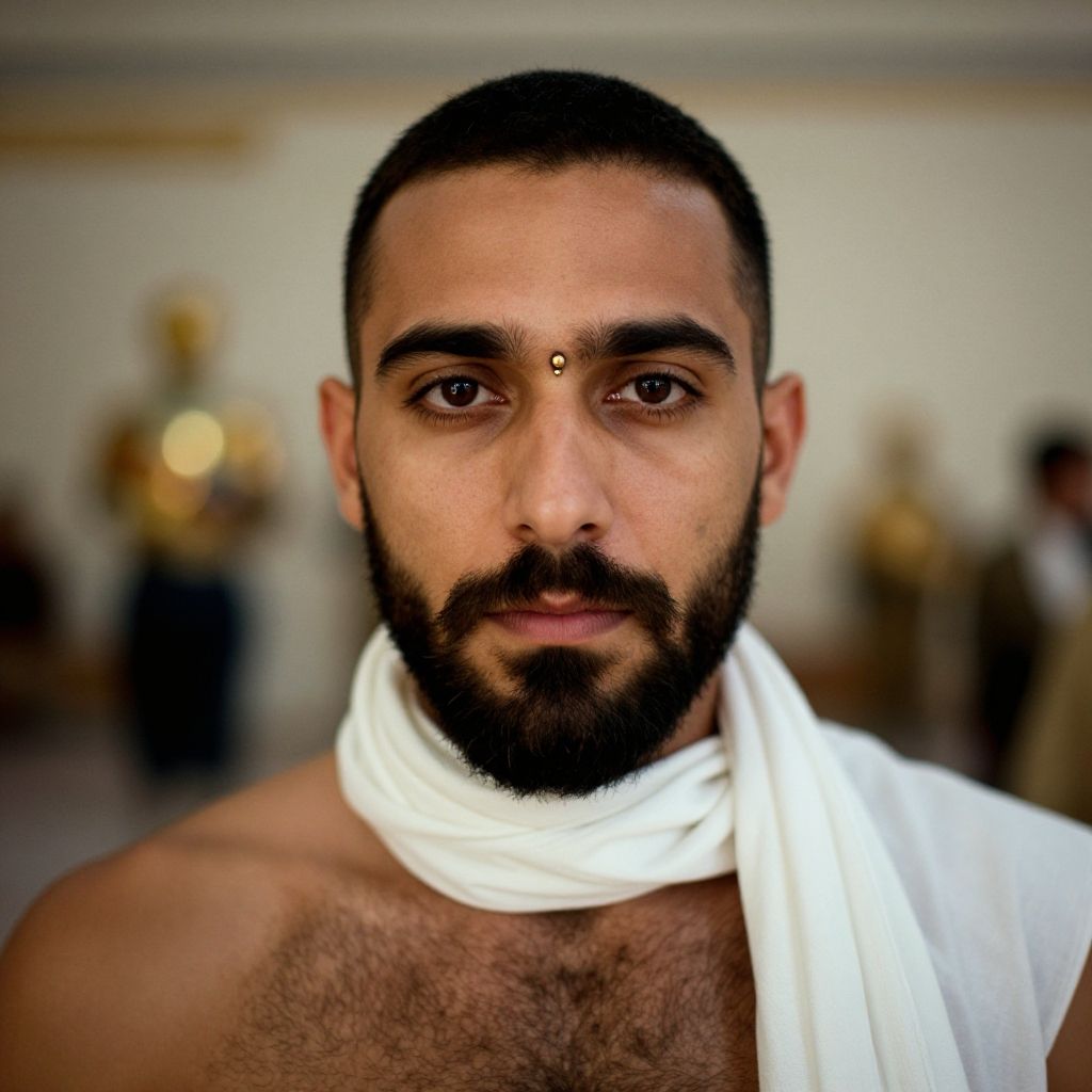 Photograph of a bearded, dark-skinned man with short black hair and a white forehead mark. He has a serious expression and is wearing a white cloth draped around his neck and shoulder, covering his chest. His chest is hairy. The background is blurred, showing indistinct, golden-colored objects and people, suggesting an indoor, possibly religious or ceremonial setting. The lighting is natural, highlighting his facial features and the white cloth.