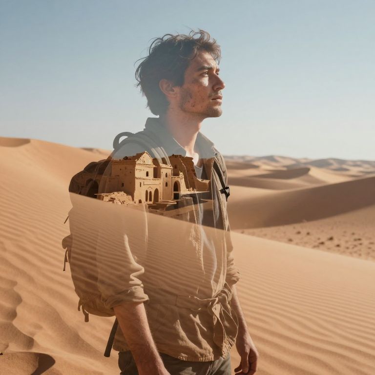 Photograph of a young, curly-haired man with a light beard, wearing a beige hoodie and carrying a backpack with a miniature desert village on it. He stands in a sunlit, sandy desert with rolling dunes in the background. His face is slightly dirty, and he looks to the right. The miniature village is superimposed over his upper body, blending with the realistic desert setting. The bright, clear blue sky contrasts with the golden sand, creating a surreal, layered effect. The image combines realistic and digitally manipulated elements, blending the subject seamlessly into the desert landscape.