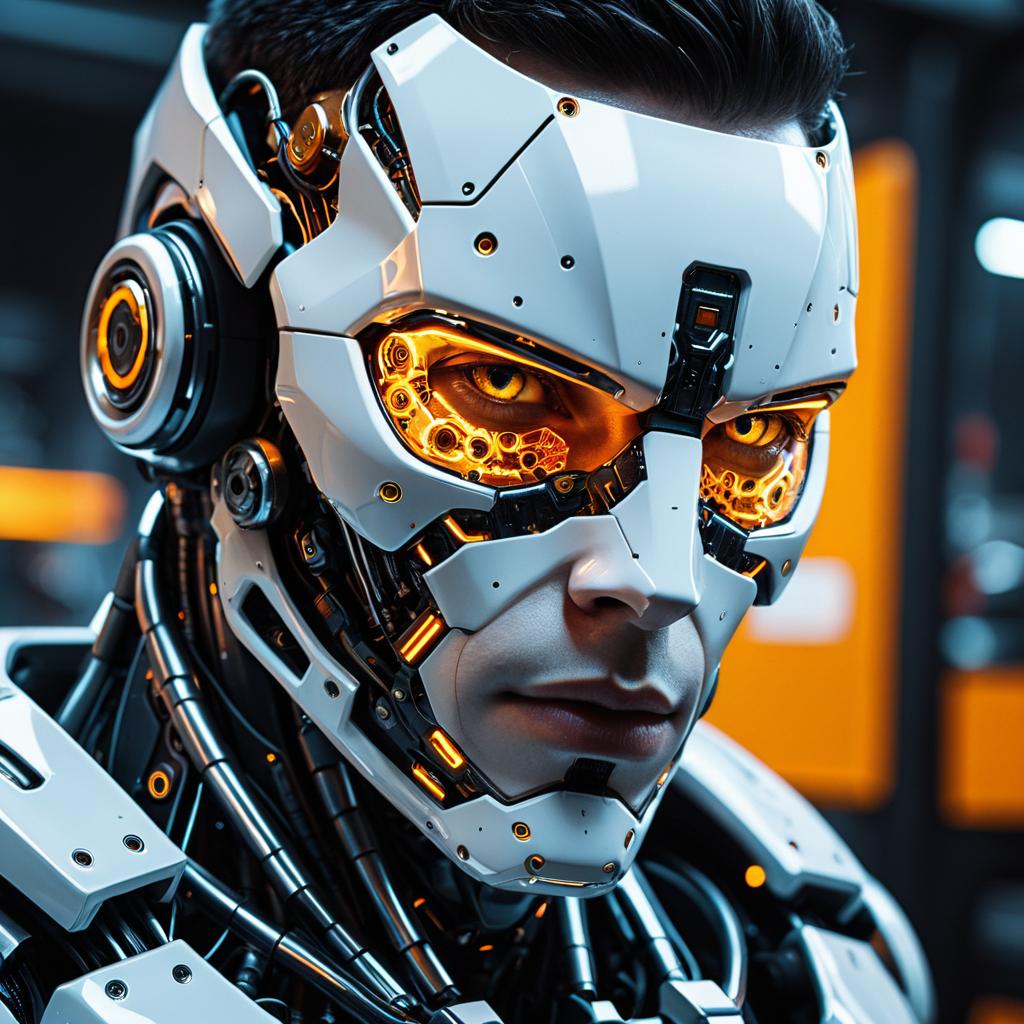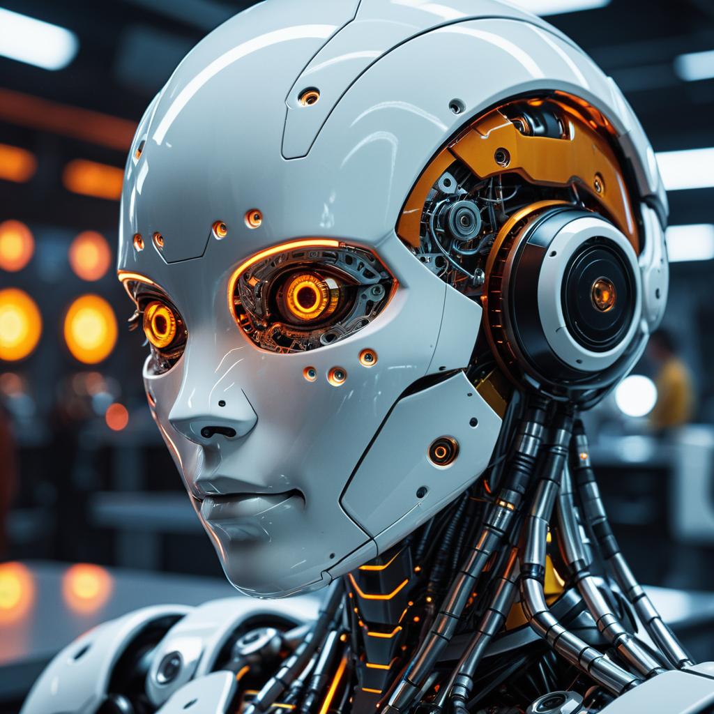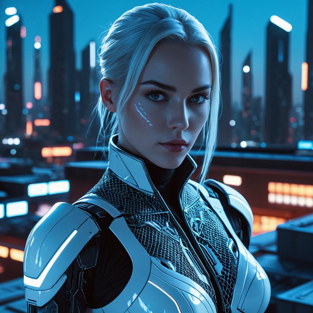 A close-up of a female android with amethyst eyes in a futuristic rainforest city, by Syd Mead style digital art, ultra detailed, porcelain skin with fine cyborg lace, cinematic lighting, 8K resolution, vibrant color palette, cinematic depth of field