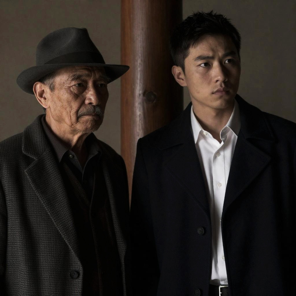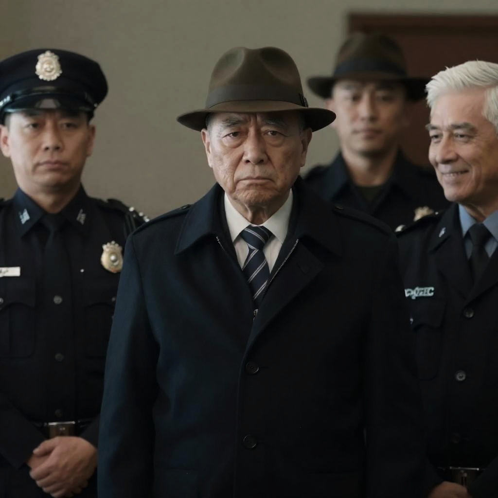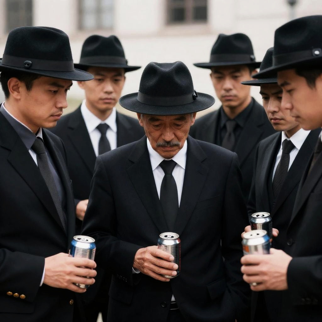 Photograph of six men in black hats and dark suits, standing close together. Central older man with mustache, holding a can, looks down. Others focus on him, some with serious expressions. One man on left has gold buttons. Background shows blurred building. Men hold metal cans and a small ball.