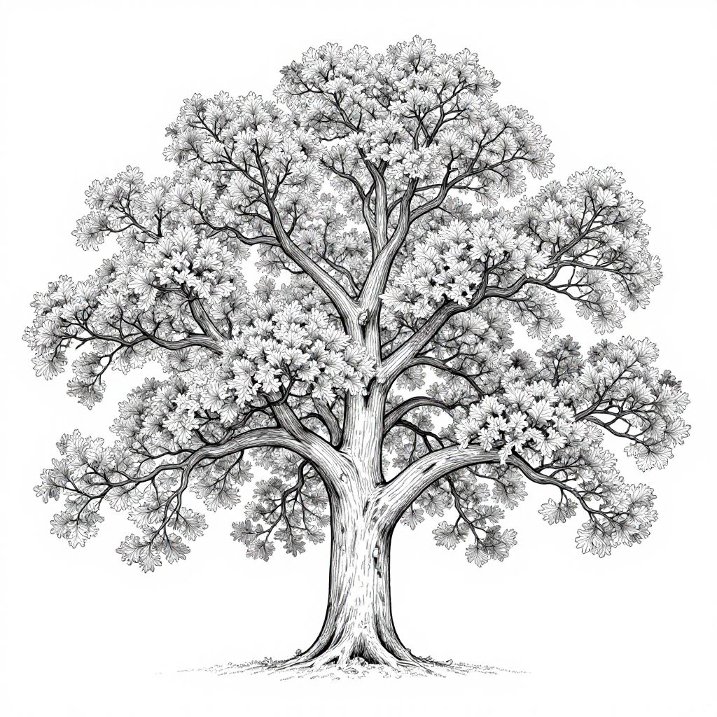 Photo to outline drawing of a majestic oak tree with sprawling branches and detailed leaves, fine line art style with emphasis on texture and form, monochrome palette, suitable for botanical illustration or adult coloring book.