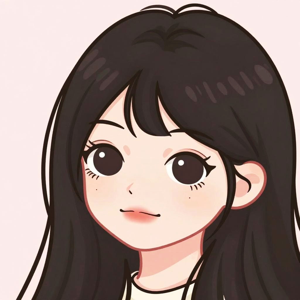 Aesthetic cartoon pfp featuring a character with sleek black hair, soft pastel background, delicate details, smooth shading, large expressive eyes, minimalistic style with subtle gradients and a gentle, calming vibe.
