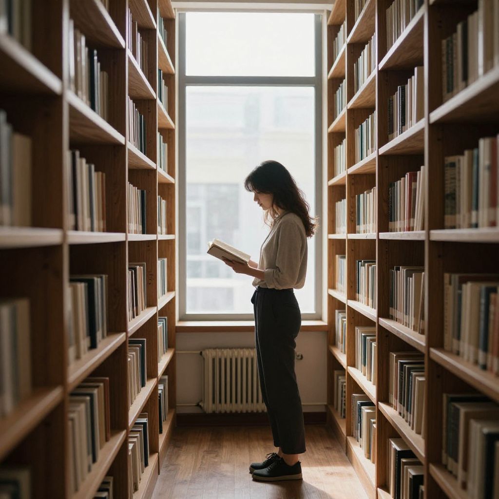 A woman stands between tall wooden bookshelves, illuminated by soft sunlight streaming through a large window, as she holds an open book, her silhouette framed by the tranquil ambiance of the library.