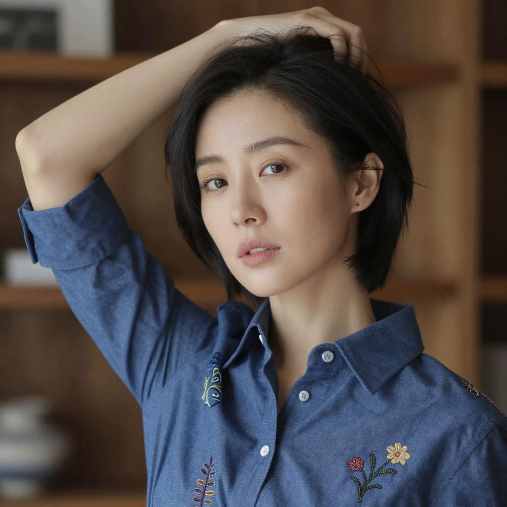 Photograph of an Asian woman with long black hair, fair skin, and red lipstick, sitting on a beige couch. She wears a pink ribbed short-sleeve top and brown pants, smiling slightly. Her right hand touches her hair. Background includes wooden paneling and a window with closed blinds.