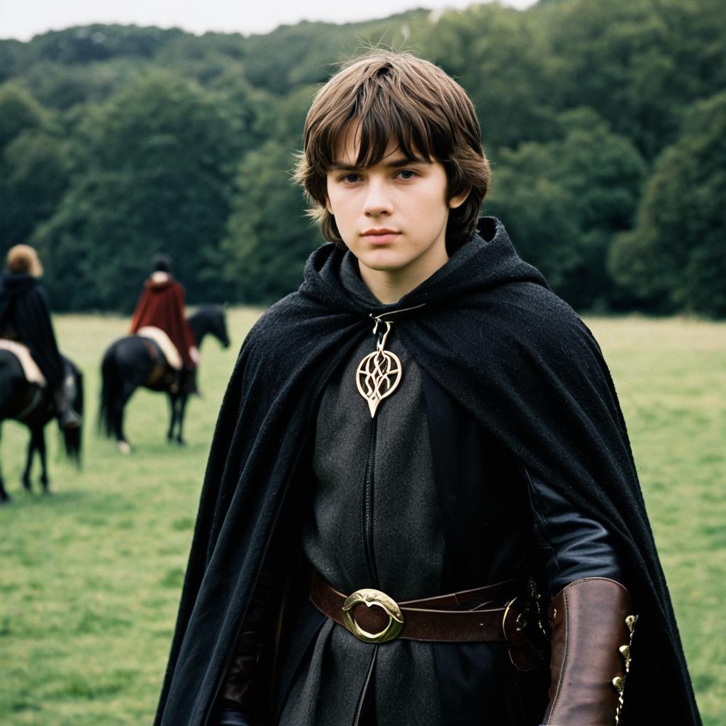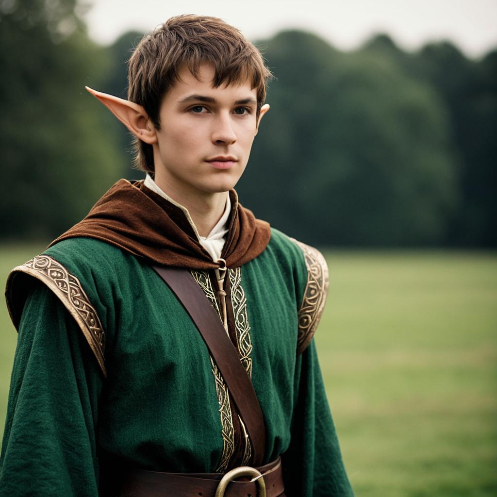 Lord rings elf fancy dress,1boy, male focus, pointy ears, solo, elf, outdoors, looking at viewer, brown hair, tree, belt, standing, tunic, blurry, blurry background, closed mouth, pants