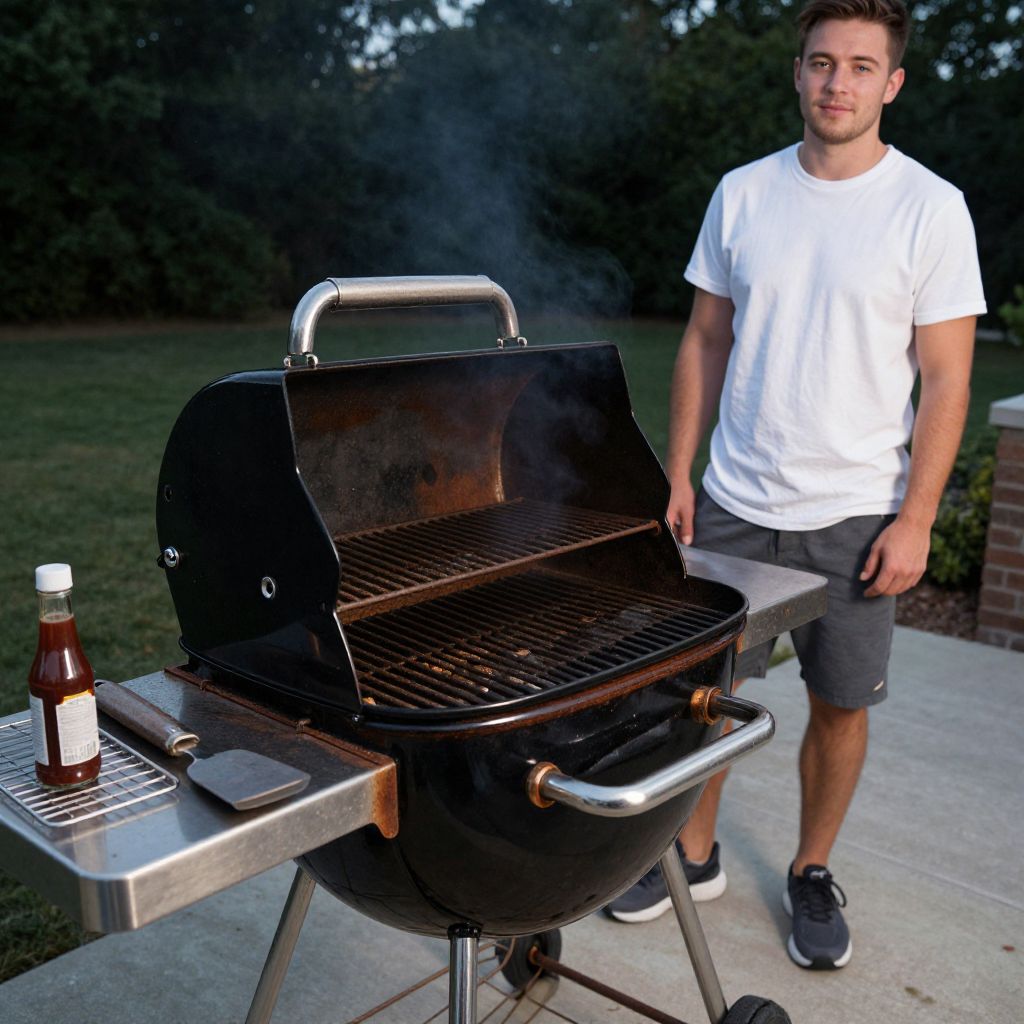 A close-up photo of a polished black grill with rust-resistant steel details, placed on a concrete patio at dusk, surrounded by grill accessories like a spatula, metal rack, and a glass bottle of barbecue sauce, with a young man in a clean white t-shirt and short shorts standing nearby, looking confident and relaxed.