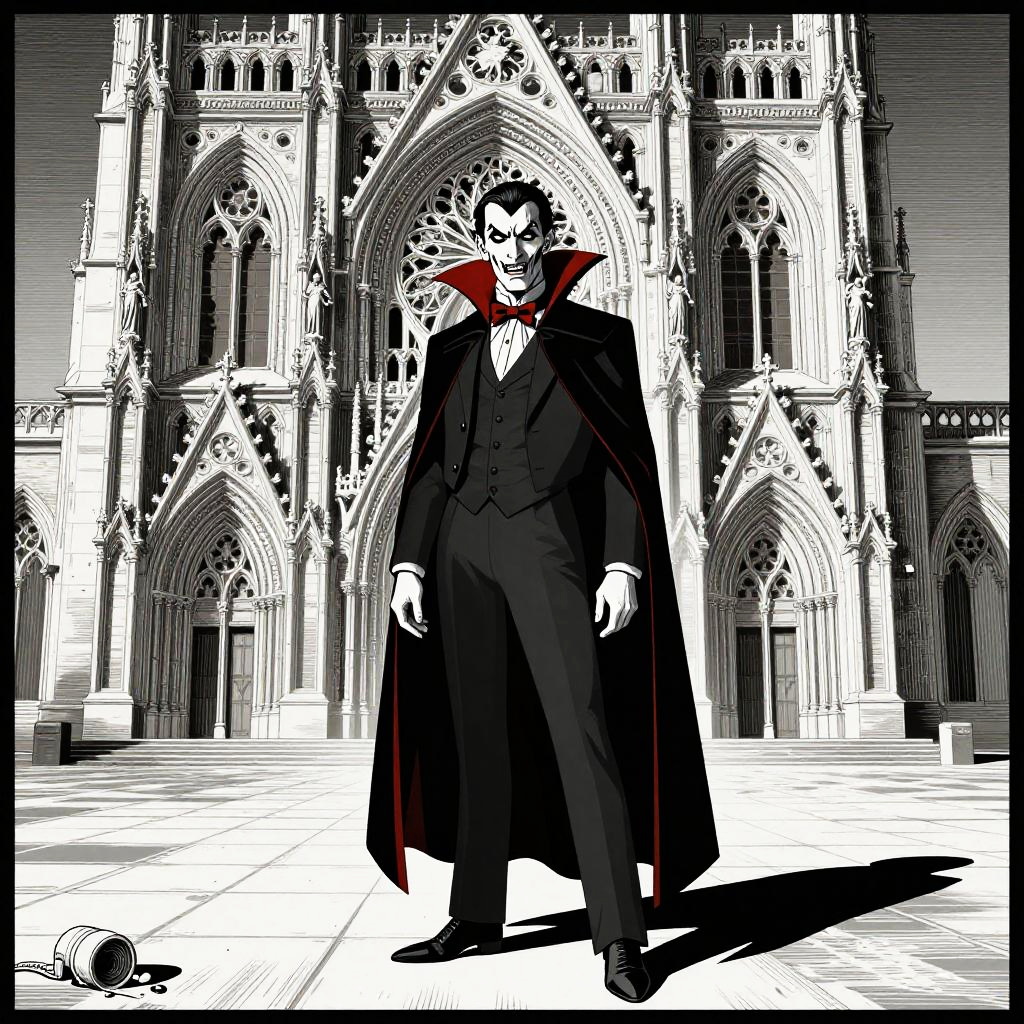M.c.escher style, Graphic novel style, Vector art, color, Vampire, Victorian suit with cape, gothic cathedral