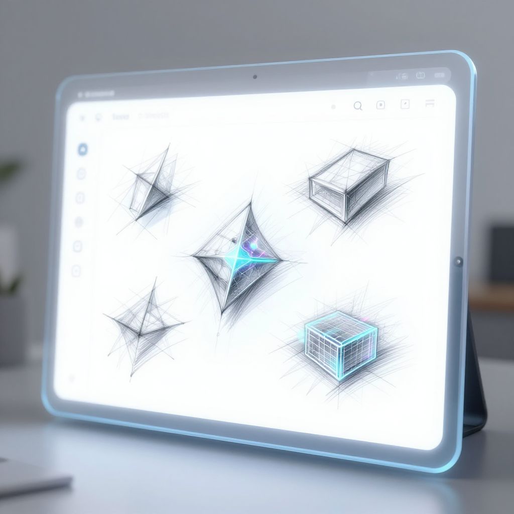 Sketch AI generator interface, a sleek holographic screen displaying evolving sketches with AI suggestions, futuristic minimalistic design, blending monochrome pencil strokes with neon highlights, digital brush strokes merging with 3D wireframes, soft focus background