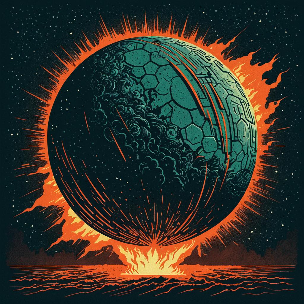 A detailed editorial illustration of a stylized Earth-like planet engulfed in flames with dramatic, moody lighting. The planet's surface shows a hexagonal pattern and swirling textures, surrounded by a bright fiery aura. The artwork features a mix of blue, green, dark orange, red, dark blue, and beige colors, with a dynamic composition and fine linocut textures, inspired by brutalism and modern art deco styles.