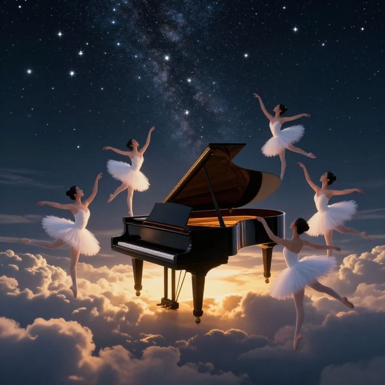 Digital art: Four ballerinas in white tutus dance around a grand piano on a glowing cloud, under a starry night sky.
