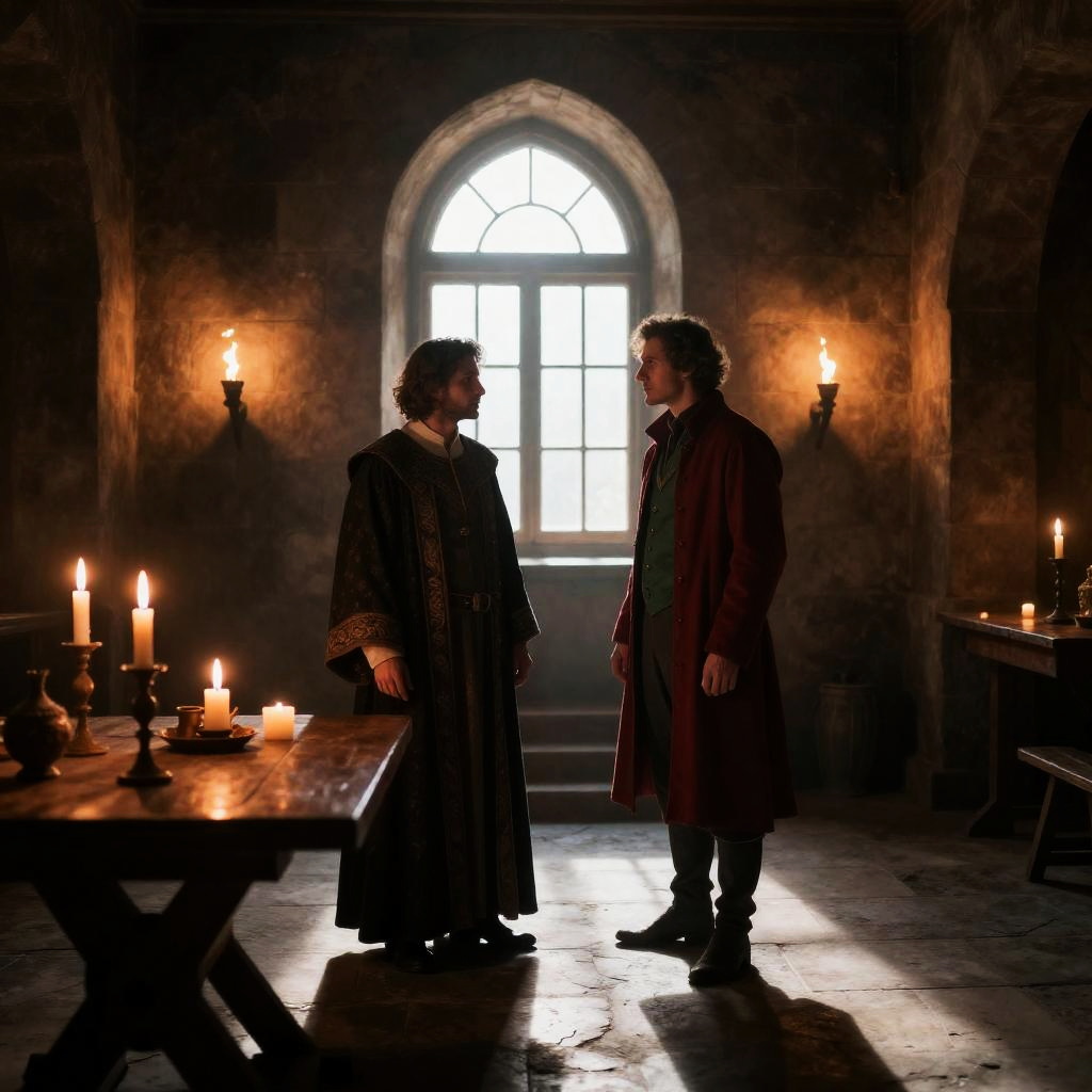 Two men in an dimly lit, stone-walled room. One in dark, ornate robe, other in red coat and green vest. Sunlight from large arched window. Wooden table with candles and objects in foreground. Flickering torches on walls. Cracked stone floor.