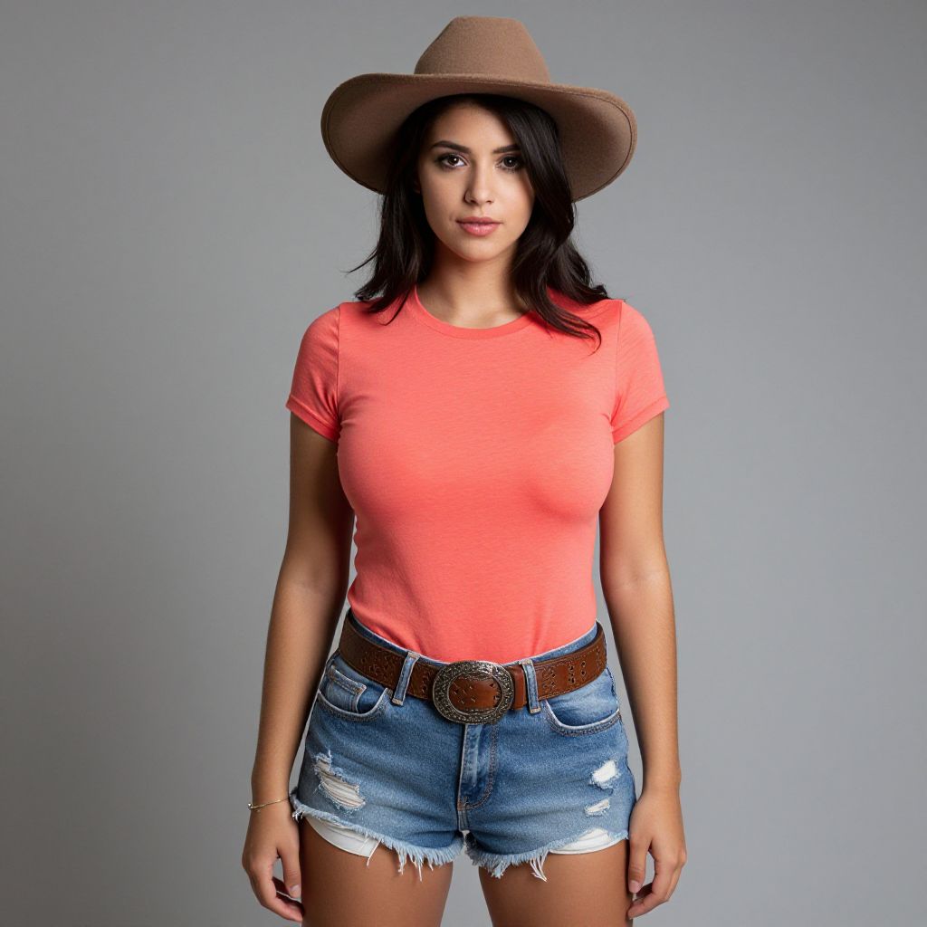"Woman, casual western style, fitted coral t-shirt, short sleeves, denim shorts with frayed hem, distressed details, brown leather belt with ornate buckle, wide-brimmed felt hat, minimal jewelry with thin bracelet, gray studio background.. Sexy. Pretty face and beаutiful eyes. Big breasts."