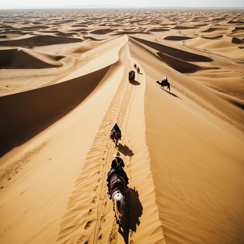 A dynamic top-down shot of a nomadic merchant leading a caravan in a vast golden desert, emphasizing depth and scale through shifting sand dunes creating layered horizons.