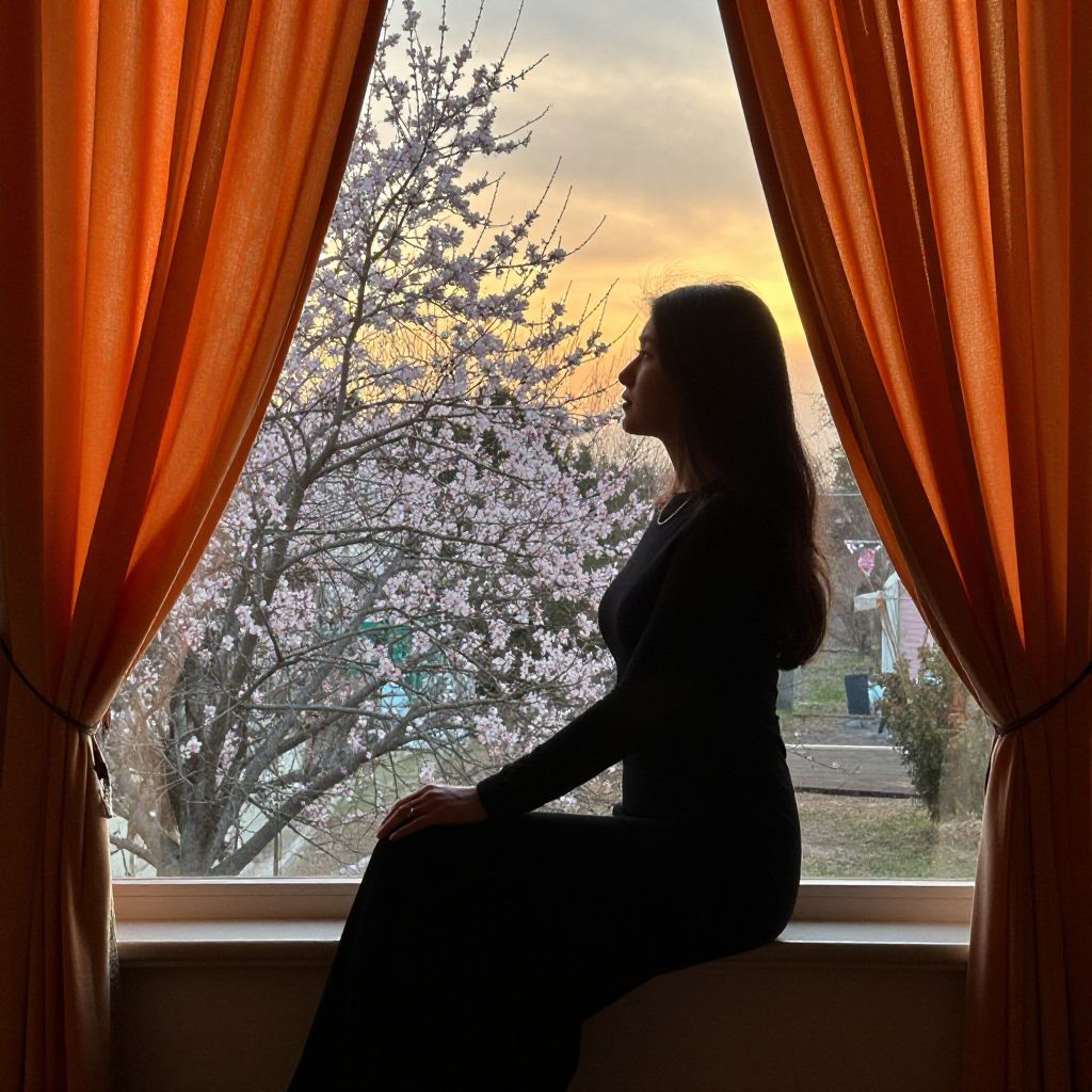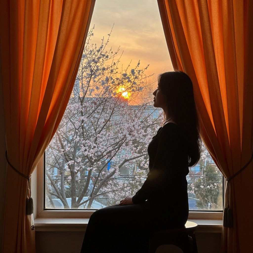 Woman seated gracefully by a window, her silhouette framed by vibrant orange curtains and a serene outdoor scene of blossoming trees against a golden sky.