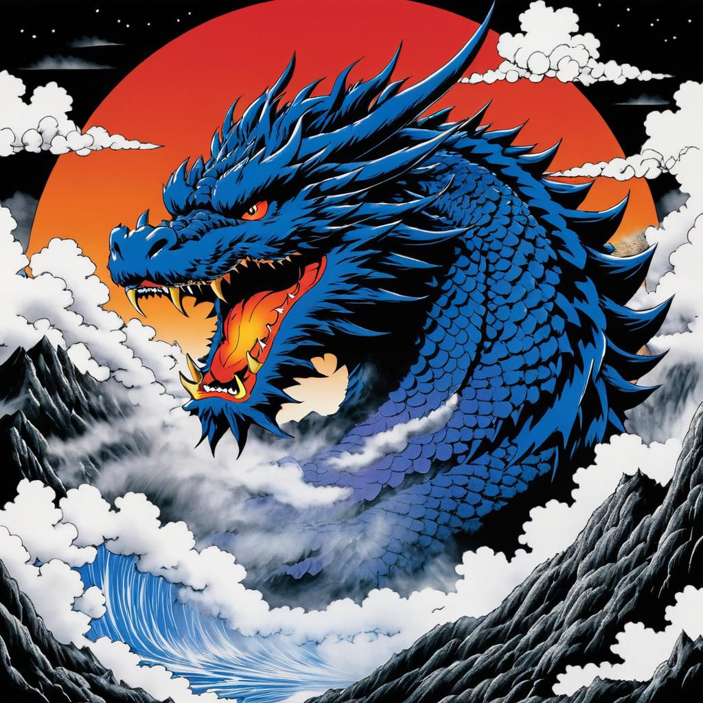 Manga-style digital artwork inspired by Akira Toriyama, depicting a colossal blue dragon with intricate scales and sharp horns emerging fiercely from a volcanic eruption. The dragon's fiery orange eyes and open mouth contrast with the cool blue tones of its body. Surrounding the dragon are erupting lava and smoke-filled volcanic cliffs under a clear blue sky.