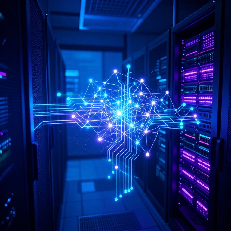 Photograph of a dimly lit server room with blue and purple neon lights. The image features two rows of black server racks filled with blinking lights, positioned on either side. In the center, a bright blue, glowing, geometric network diagram with interconnected nodes and lines extends across the aisle, creating a futuristic, digital effect. The background is blurred, emphasizing the vivid, neon-lit network diagram in the foreground. The overall atmosphere is high-tech and futuristic, with a strong contrast between the dark server racks and the vibrant blue and purple lights.