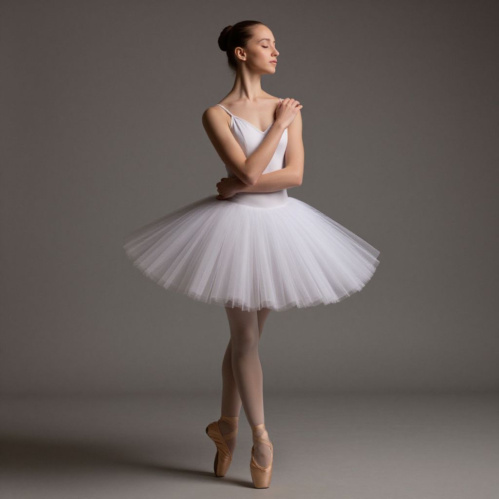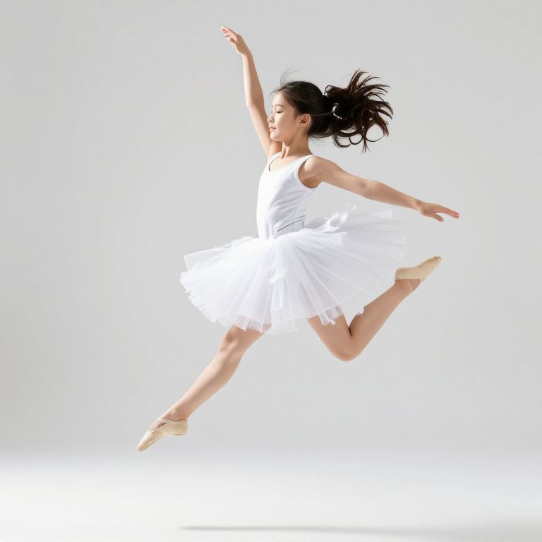 Photograph of an Asian female ballet dancer in a white tutu, leaping with arms and legs gracefully extended against a bright white background.