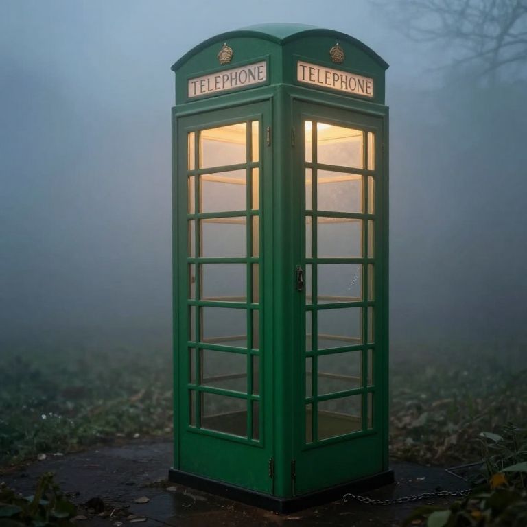 A vintage green telephone booth stands suspended in a dense, ethereal fog, its interior warmly illuminated by a soft light, while a solitary chain dangles from its side, evoking a sense of nostalgia and mystery.