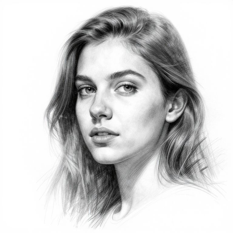Monochromatic digital pencil drawing of a young woman with wavy hair, soft facial features, and a neutral expression, set against a white background.