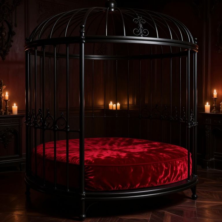Bdsm cage bed design featuring black wrought iron bars, plush red velvet mattress, ambient candlelight, gothic style room with dark wood accents, highly detailed and atmospheric mood