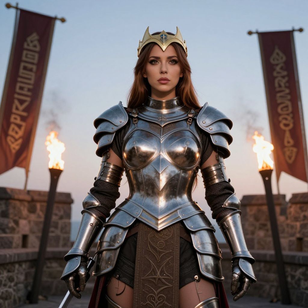 A stunning woman warrior princess in a full metallic bold armor set, standing atop a castle rampart with torches burning in the background, her face elegant yet fierce with high cheekbones and a determined expression, wearing a golden crown and a battle-scarred chest plate that reflects the twilight sky, surrounded by ancient runes and wind-blown banners.. The woman has big tits and cute face