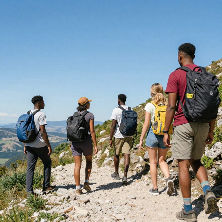 Black guys with white girl exploring a scenic mountain trail, wearing casual hiking attire, breathtaking panoramic view of nature, bright daylight with clear blue sky, harmonious and adventurous atmosphere