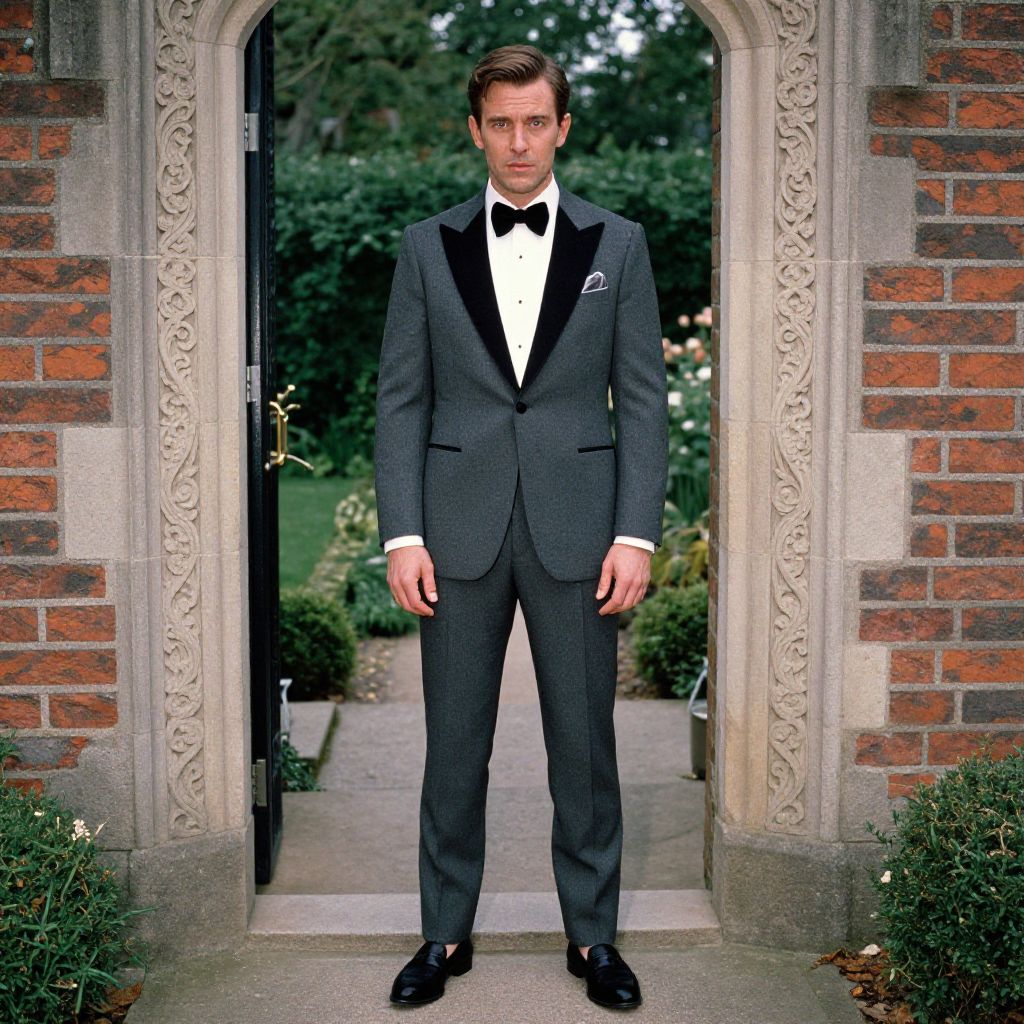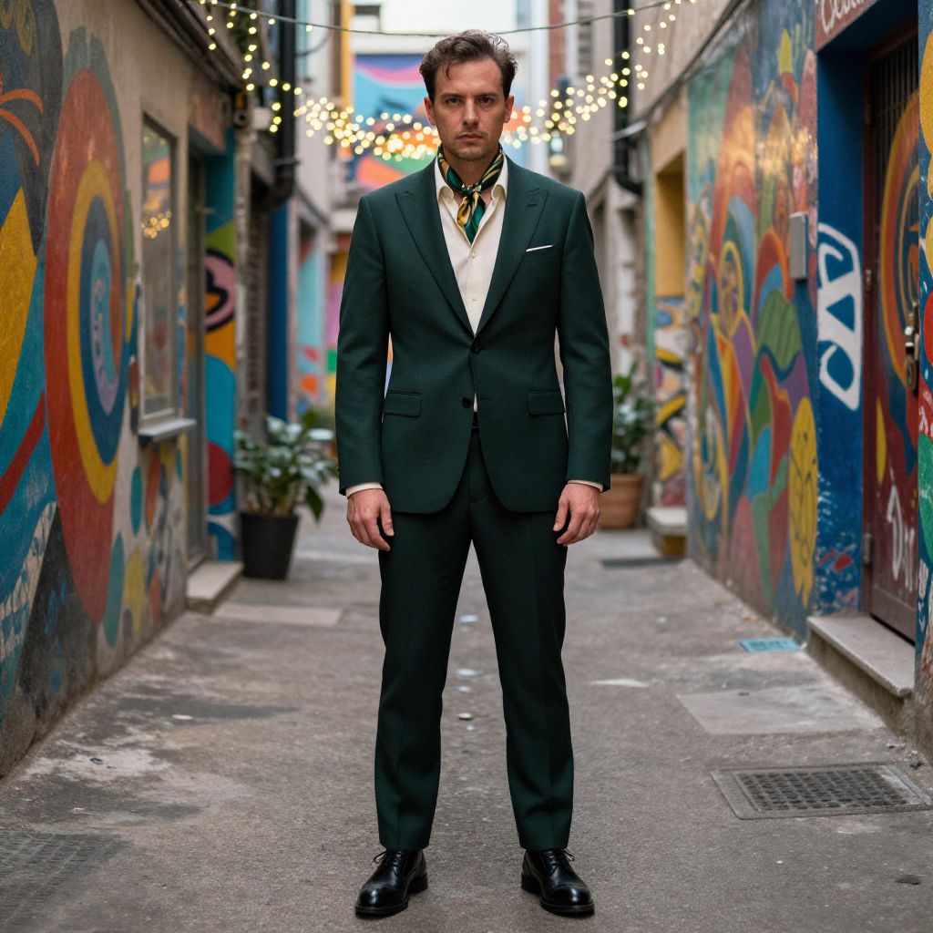 A man, black satin lapel suit, ivory dress shirt, deep green silk tie, polished oxford shoes, elegant silk pocket square, modern glass atrium, vibrant art installations, bustling café terrace, Ilford film stock, confident expression Man has masculine face and piercing eyes