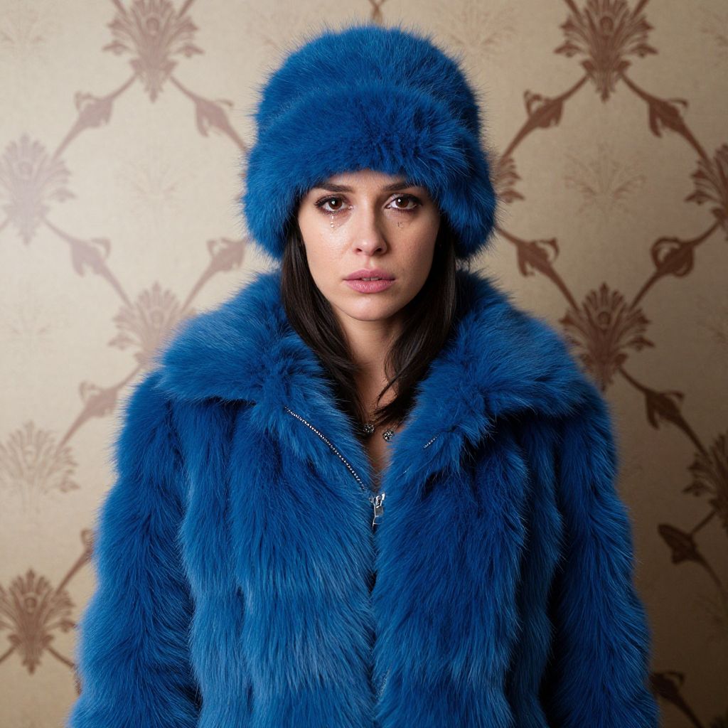 A woman in a blue fur coat and hat stands in front of a patterned wall, with tears in her eyes.