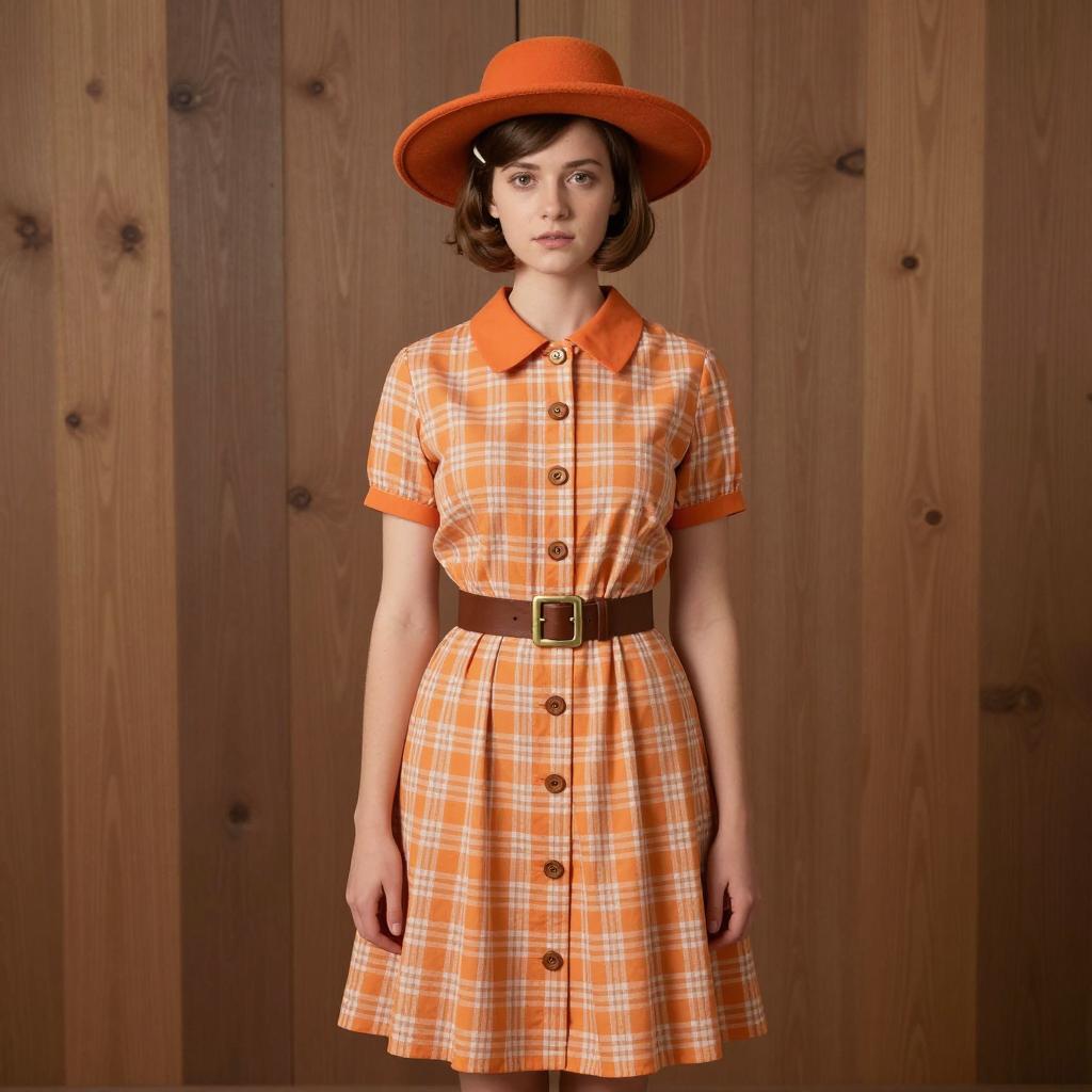Portrait of a young woman with short brown hair wearing a vintage 1960s style orange plaid dress with an orange collar, wooden buttons, and a brown belt with a gold buckle. She also wears an orange hat, standing against a wooden panel background with a neutral expression and soft lighting.
