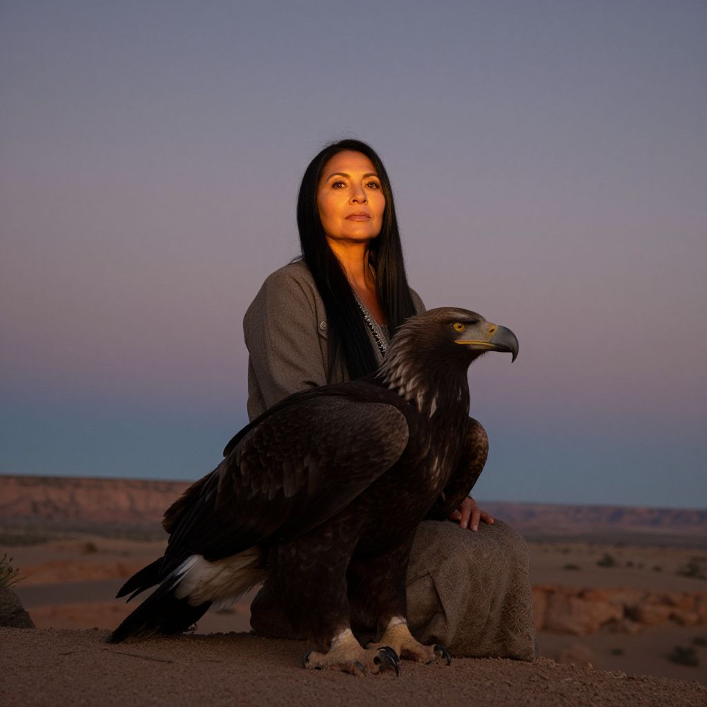 Envision a mirrorless camera's portrait of a Native American woman in her forties with deep brown eyes and cascading jet-black hair. She sits atop a majestic eagle on a cliff edge overlooking a desert at twilight. The full moon casts soft shadows across her face, illuminating it with a warm glow from an unconventional low angle. Her expression exudes wisdom and connection to nature, inviting viewers into the emotional gradient of serenity and strength that surrounds her.