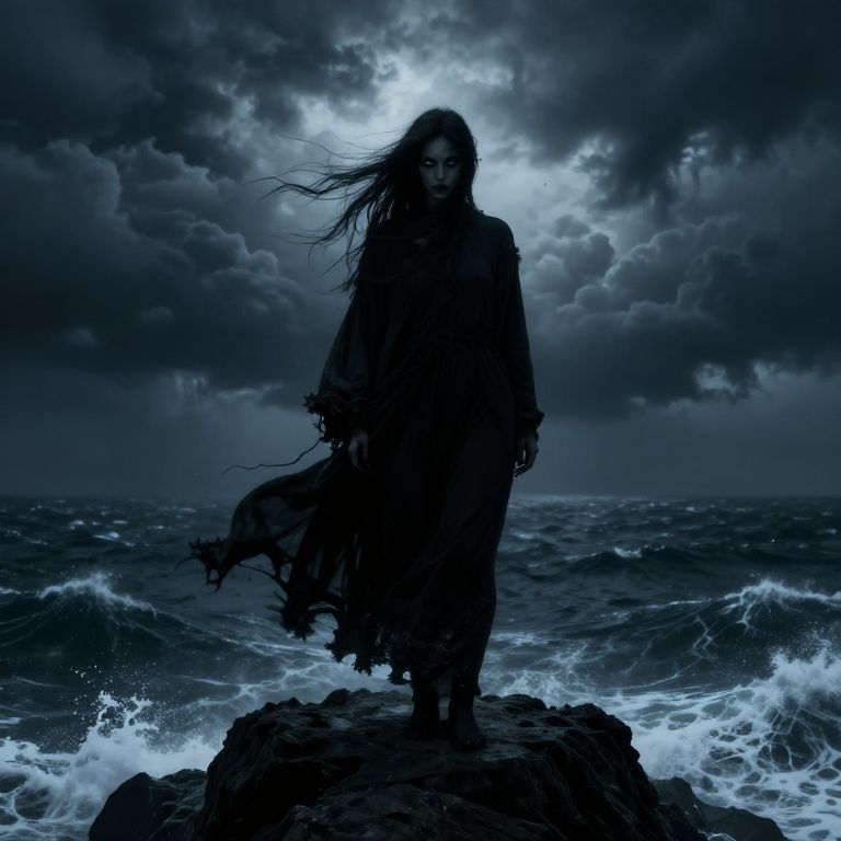Digital artwork depicting a dark, silhouetted figure of a woman with long, wind-swept hair standing on a rocky cliff against a stormy, moonlit sea. She wears a tattered, flowing cloak that billows in the wind. The sky is filled with dense, dramatic clouds, with a bright, glowing moon peeking through, casting an eerie blue light over the turbulent waves. The overall color palette is dominated by deep blues and blacks, creating a moody, atmospheric scene. The woman's expression is intense and mysterious, adding to the haunting, supernatural feel of the image.