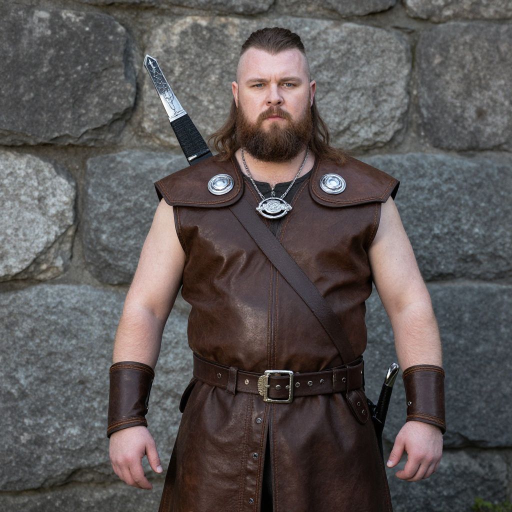 Photograph of a muscular, bearded man with light skin and long brown hair, styled in a topknot. He wears a sleeveless brown leather tunic with metal shoulder plates, a dark brown belt with a square buckle, and matching leather wristbands. A sword with a silver hilt is sheathed on his right shoulder. He stands against a backdrop of large, gray, irregular stone bricks. The man's expression is serious, and he gazes directly at the camera. The lighting is natural, highlighting the texture of his leather outfit and the stone wall behind him.