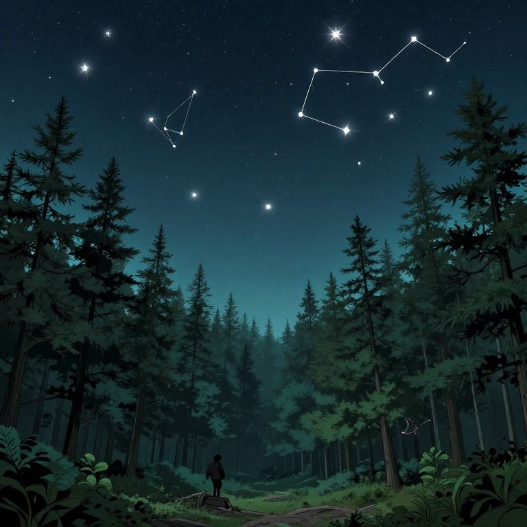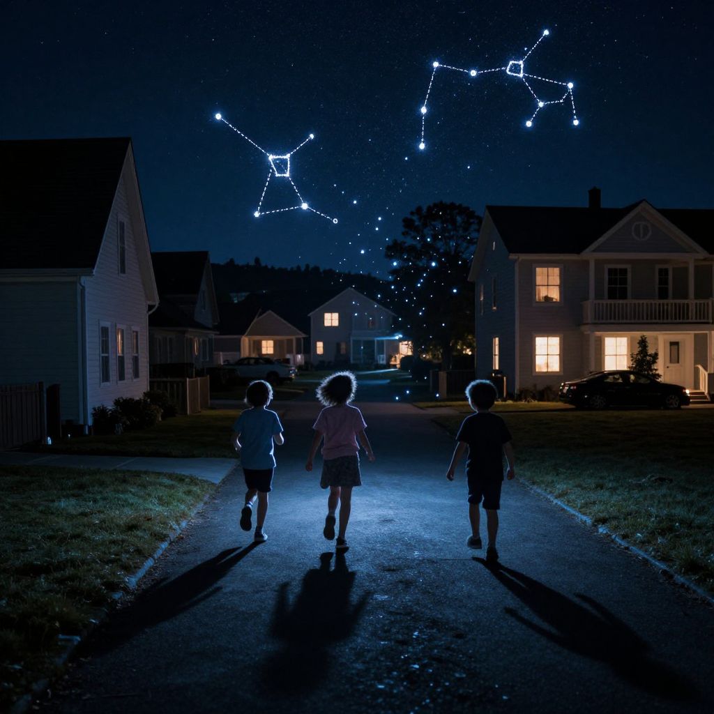 Photograph of three children, silhouetted in blue light, walking down a suburban street at night. The sky is dark, adorned with a constellation display of white stars and connected dots. Houses on both sides have warm yellow lights, creating a contrast. The children, wearing casual clothes, are centered in the foreground, with grassy lawns on either side and parked cars visible. The street is illuminated by the blue light, casting long shadows. The scene evokes a sense of wonder and curiosity, with the children seemingly admiring the night sky.