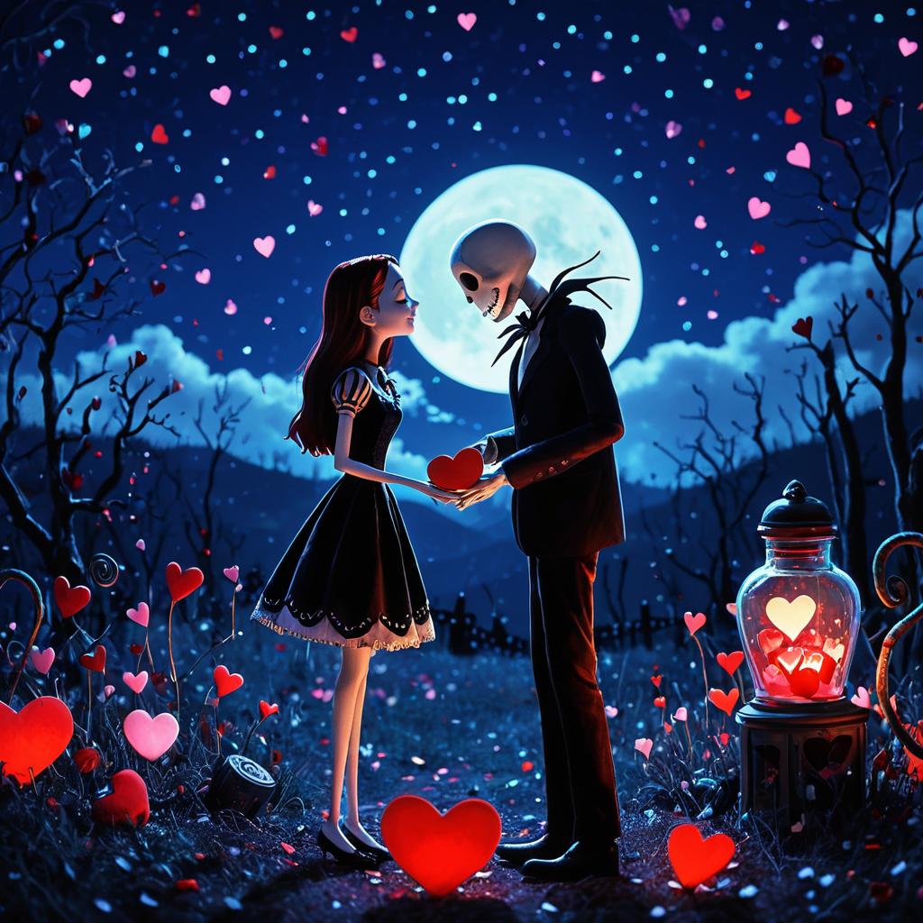 The Nightmare Before Valentine’s Day, Bottlehead and Fragile Pee-Wee, showing affection, glowing hearts, a Valentine love fest, glowing potion hearts, night sky in the background, style of Claire Hummel, stop motion animation, cinematic composition, trending on Pixiv Fanbox, popcore anime art style, vibrant colors, vivid, glowing