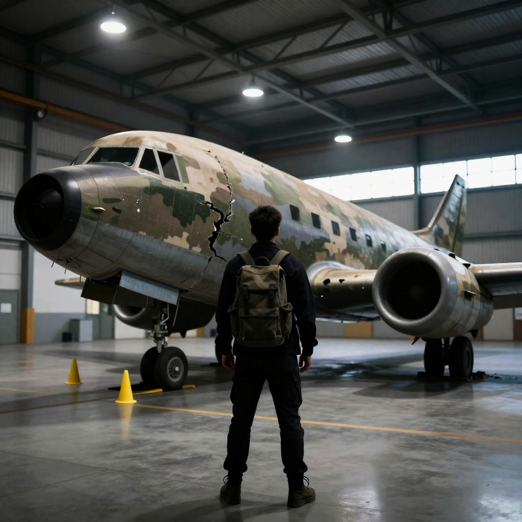 Photograph of a severely damaged airplane in a hangar. Three men in dark blue jackets with "FBW" on the back stand in the foreground, observing the wreckage. The airplane's red and white paint is peeling, and debris is scattered. A man in a brown uniform with a hat stands to the right. Multiple people in the background. Bright hangar lights.