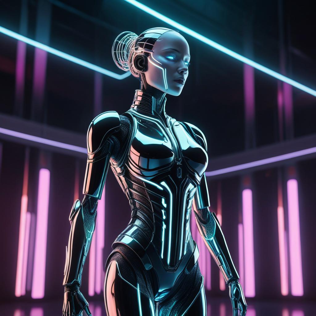 Female Android Musician in Neon Concert Hall