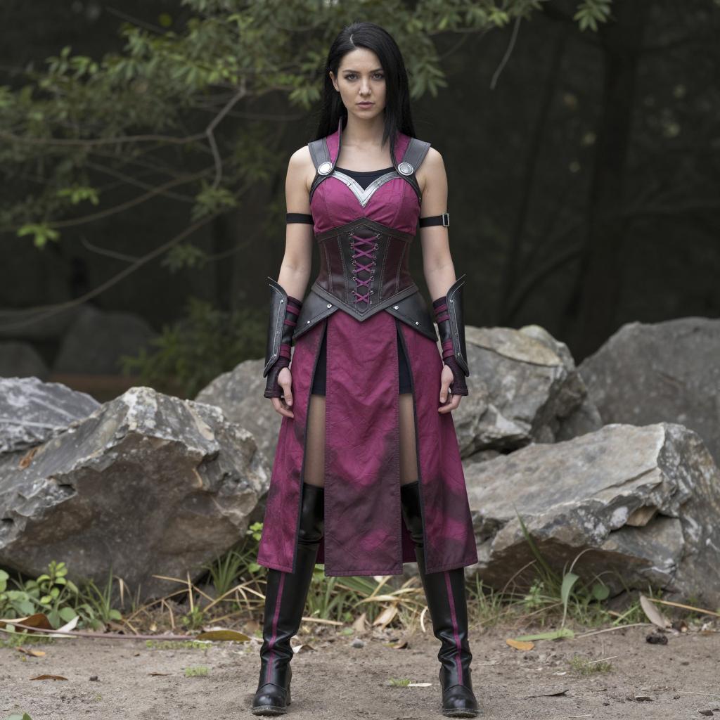 Male mileena cosplay, photo of a woman standing outdoors, realistic style, fantasy warrior outfit, magenta and black armor, sleeveless top with corset laces, long flowing skirt with thigh-high slits, black boots with magenta stripes, black hair, serious expression, forest background, rocks and greenery, overcast lighting, standing on dirt path, full body shot, detailed ures on armor and skirt, natural light, realistic colors