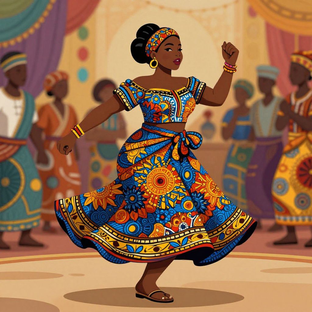 Dynamic illustration of a Nigerian woman body shape engaged in traditional dance, vibrant flowing fabrics and energy captured in mid-motion, set against a festive cultural background with rich colors and intricate patterns, vivid and expressive art.