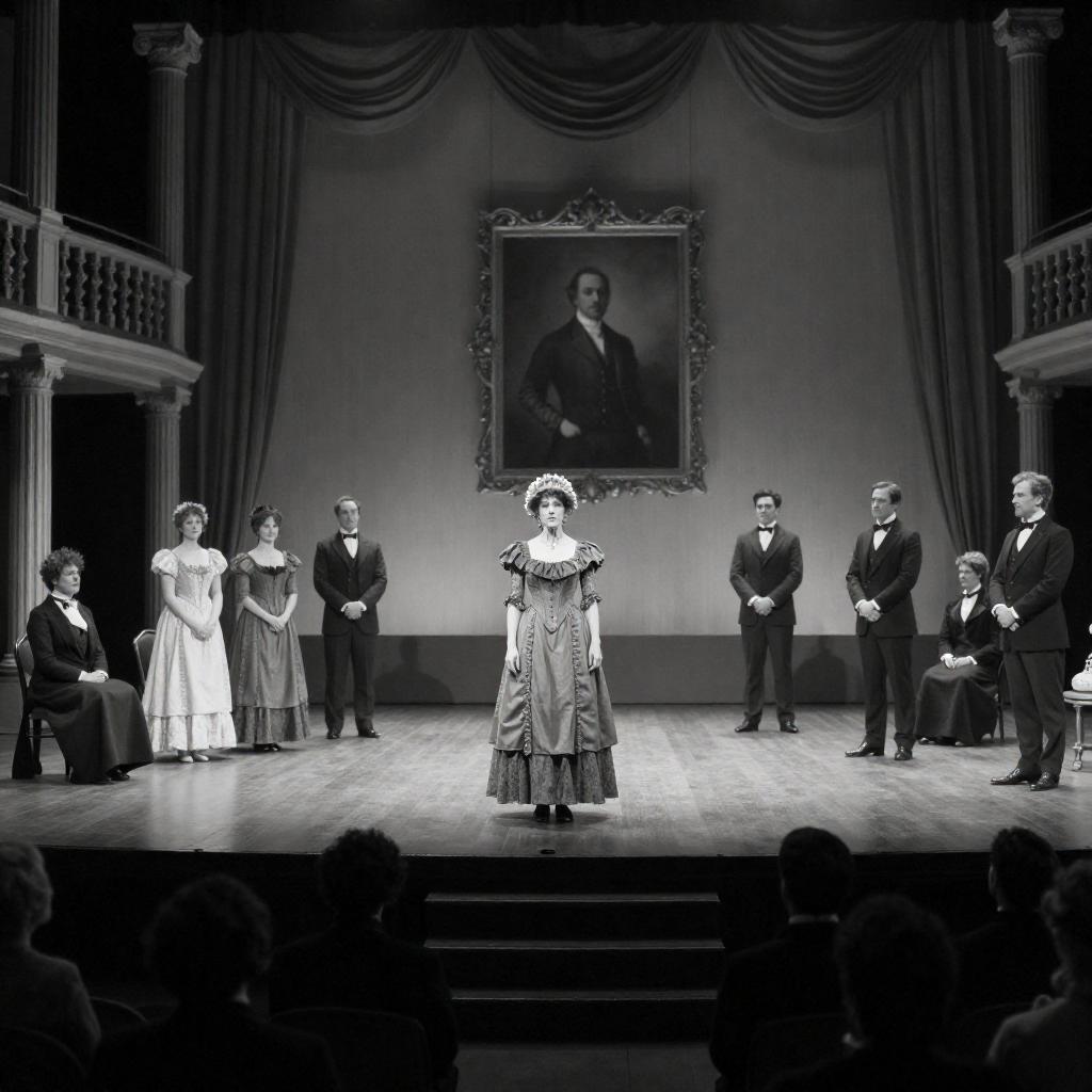 Black-and-white photograph of a grand, ornate theater entrance at night. The facade features intricate carvings, large columns, and a central decorative panel. People in vintage clothing stand in front, with cars parked along the street. The theater's elaborate architecture is illuminated, contrasting with the dark surroundings.
