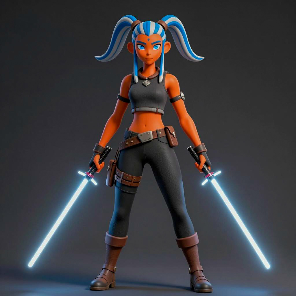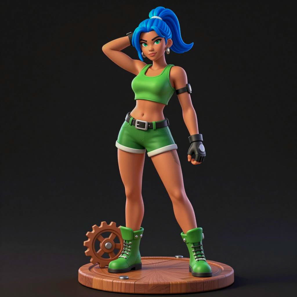 Digital illustration of a sexy female character with blue hair in a high ponytail. She stands confidently with one arm behind her head, revealing a toned, muscular abdomen. She wears a green crop top with buttons, green shorts with white trim, and green boots with black straps. She has black fingerless gloves. Her eyes are blue and intense. A black belt with a silver buckle is around her waist. At her feet, there's a circular wooden base with a gun lying on it. The background is solid black. The character has a determined expression. One person.