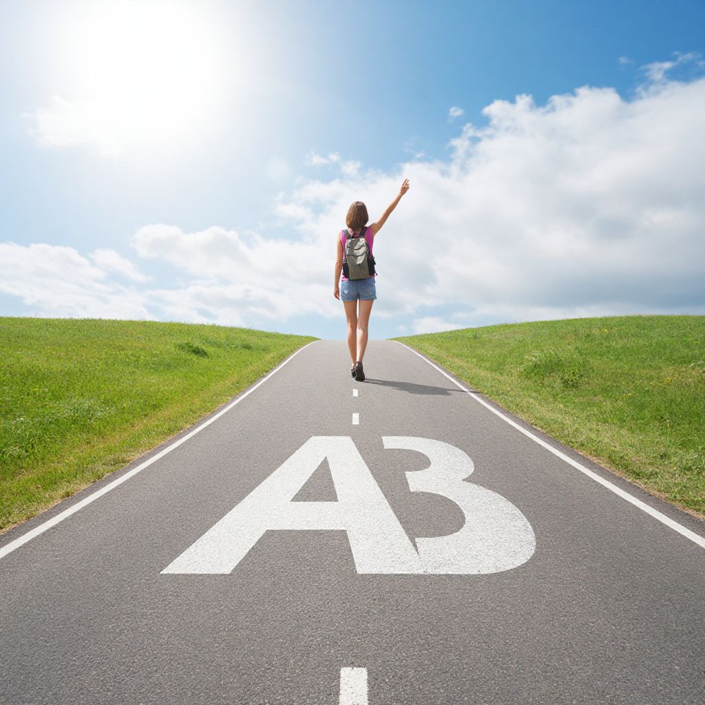 From A to B. Life's journey, concept. Travelling woman by rising road.