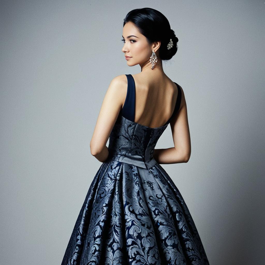Full body, 1girl, solo, elegant dress, jewelry, earrings, intricate detail, regal woman with sleek ebony hair pulled into a high chignon, warm amber eyes beneath brushed gold eyebrows, hand on own hip, confident, poised, classic beauty, timeless, ornate, delicate fabric, flowing skirt, rich colors, serene expression, nuanced, subtle highlights, depth, white background