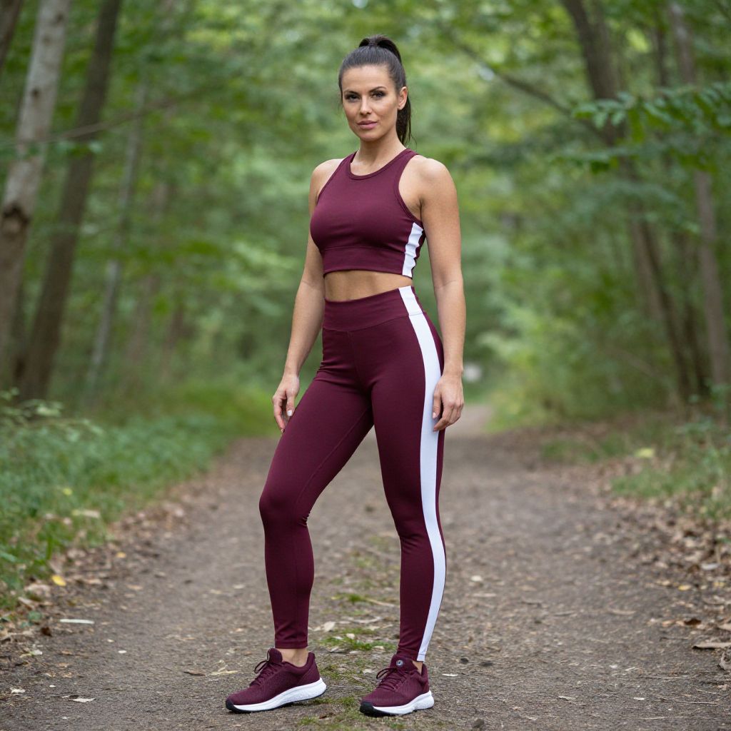 A woman stands confidently on a forest path, dressed in stylish maroon workout attire that features a white stripe accent. Surrounded by lush green trees, she embodies an active lifestyle, showcasing fitness and nature's beauty in harmony.