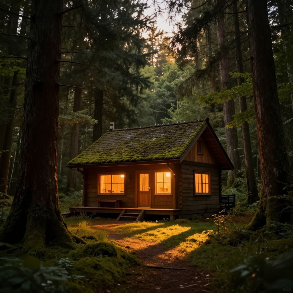 Midjourney home nestled in a serene forest clearing, cozy wooden cabin with warm glowing windows, surrounded by towering ancient trees and soft moss, golden hour lighting casting long shadows, peaceful and inviting atmosphere, detailed digital art style