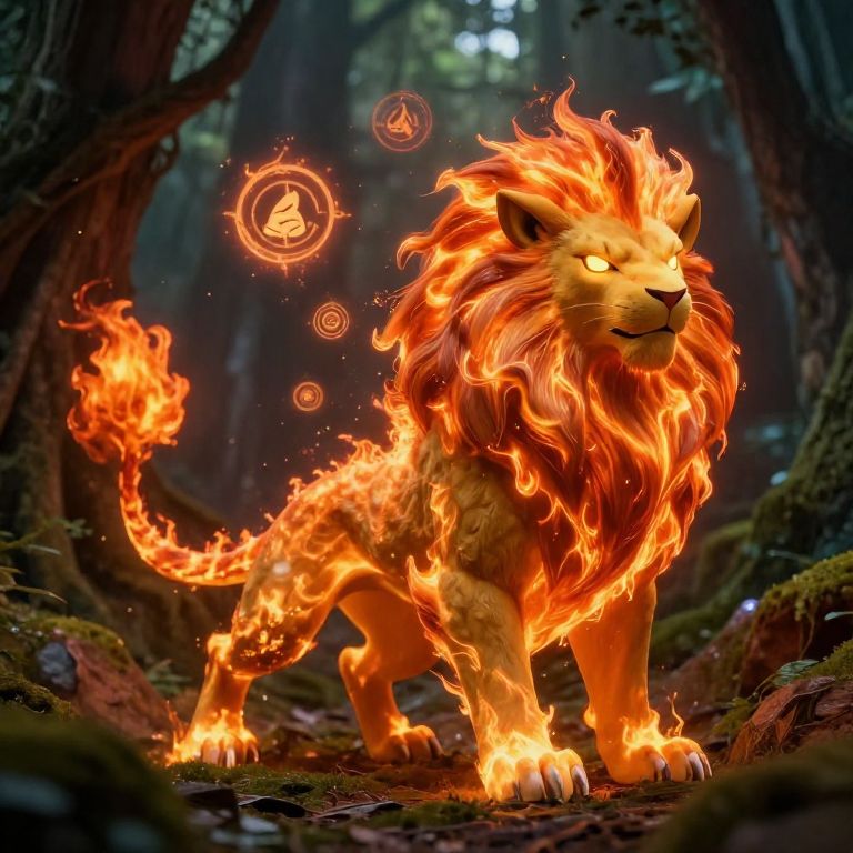 Pokemon fire lion in an ancient forest setting, tail and mane erupting in flames, glowing eyes, mystical symbols floating around, blending fantasy and nature elements, rich textures on fur and fire, cinematic composition